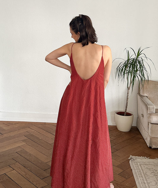 The Lelya Dress a long, relaxed dress with a soft V-neckline in the front and a deeper back neckline. You can sew it in a full-length or shorter version. It also includes optional side seam ties & side seam pockets.