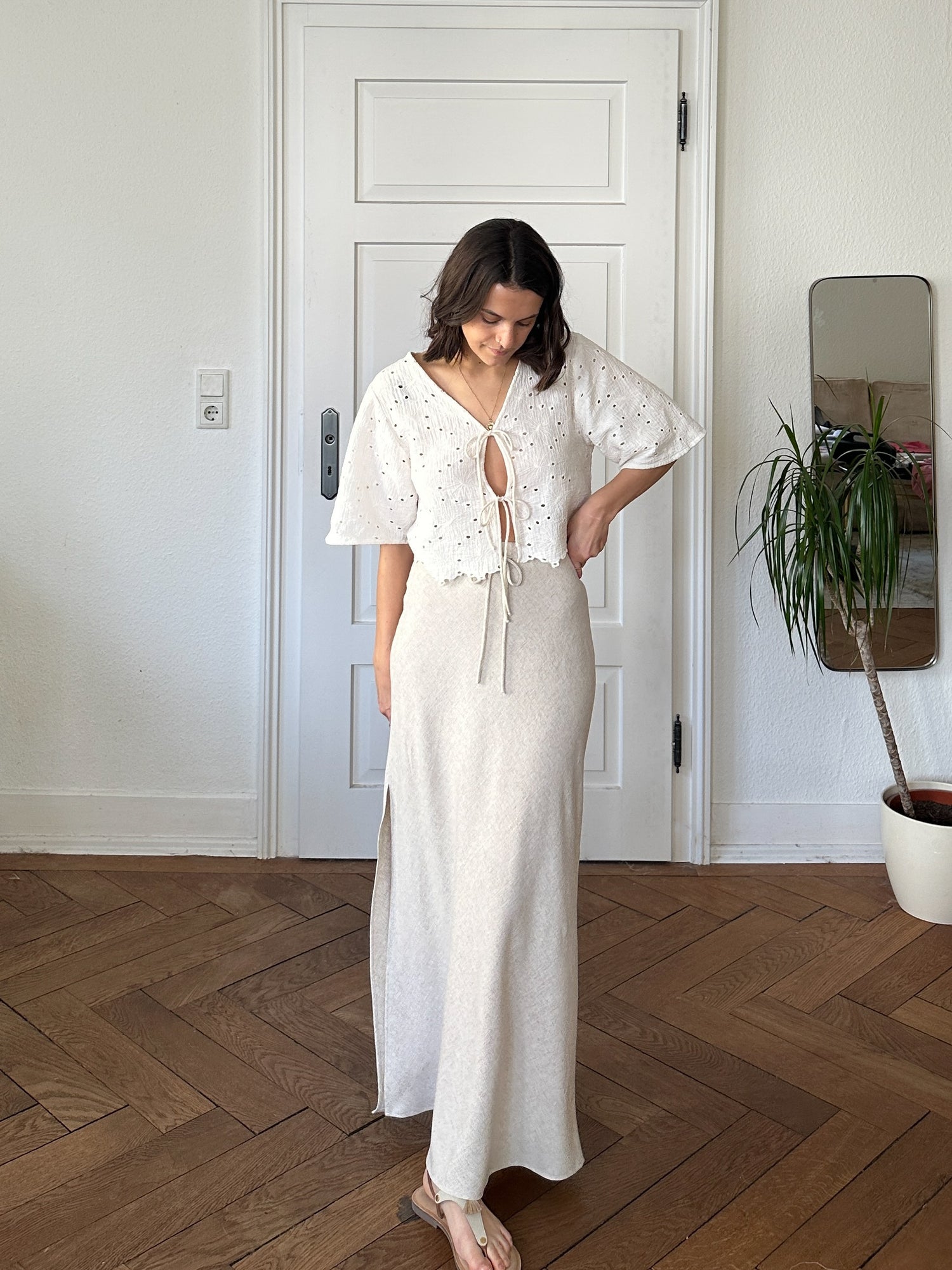The Sarah Skirt is a relaxed bias-cut skirt that drapes beautifully. The pattern includes three lengths: mini, midi & maxi. It features an elastic waistband with an optional front drawstring and can also be sewn with an optional side slit.